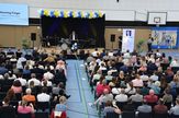 Zum offiziellen Festakt in der Sporthalle Alte Waage konnte Schulleiter Björn Flader 320 geladene Gäste begrüßen. Die Veranstaltung bot einen eindrucksvollen Rückblick auf eine wechselvolle und zugleich erfolgreiche Schulgeschichte. Zeitweise war die Schule auf fünf Standorte verteilt, bis man 1990 das Gebäude der ehemaligen Ina-Seidel-Schule als zweiten dauerhaften Standort übernahm – wusste Björn Flader zu berichten. Sage und schreibe 15-mal wechselte die Schule ihren Namen, wie Bürgermeister Kornblum in seiner Gratulationsrede betonte, bis sie 2005 ihren jetzigen Namen als Otto-Bennemann-Schule erhielt. Auch das ein Jubiläum, das an diesem Tag gefeiert wurde: 20 Jahre Otto-Bennemann-Schule. „Zu einer Feier soll man nicht ohne Geschenk kommen“, beendete Oberbürgermeister Kornblum seine Gratulationsrede und übergab der Schule eine Erinnerungstafel an Otto Bennemann. Die von der Otto-Bennemann-Stiftung finanzierte Tafel informiert prägnant über Bennemanns Leben und Leistungen und wird nun gut sichtbar im Eingangsbereich der Schule angebracht.